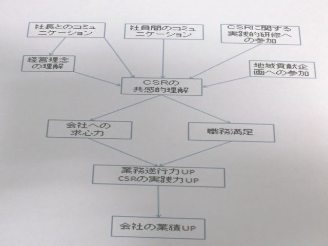 矢印は、因果関係を示します。例えば、「業務遂行力UP CSRの実践力UP」のためには、「会社への求心力」や「職務満足」を上げることが必要で、その2つの要素を高めるには、「CSRの共感的理解」が大事、という読み方ができます。このような「つながり」が、CSRの実践構造です。